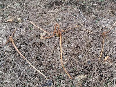 ↑ この畑は何の畑か分かりますか?枯れた葉の下には里芋が植わっています。