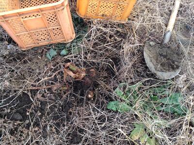 ↑ 葉が枯れた下を掘ると、親芋、子芋、孫芋が出てきました。
