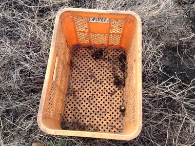 ↑ 大量の大根を収穫し、軽トラックに積んでいます。1カゴに15本の大根が入っています。カゴを地面から
