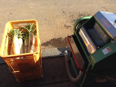 ↑ 畑から作業場に戻ってきた大根を1本1本洗浄機で洗っています。大根の洗浄機のタワシの部分は柔ら