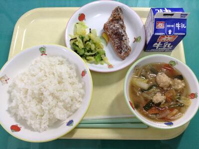 ごはん、サバの竜田揚げ、キャベツの塩昆布和え、ちゃんこ汁、牛乳