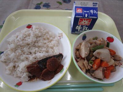 牛乳 ご飯 サバの味噌煮 筑前煮