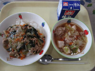 牛乳 野菜と豚肉のあんかけ丼 肉団子スープ