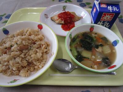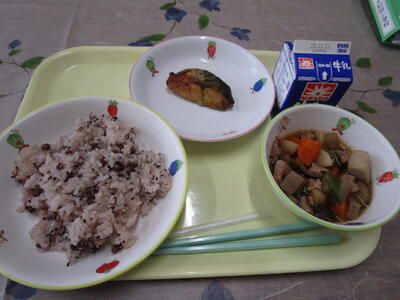 牛乳 赤飯 鯖のカレー焼き いろどり