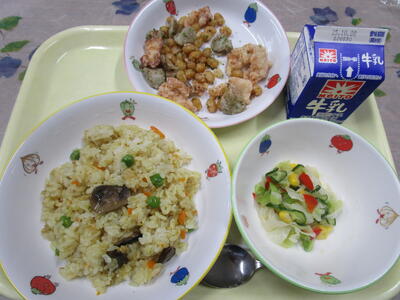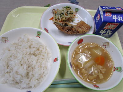 牛乳 ご飯 チキンと豆のノリ塩揚げ 白菜の昆布和え 田舎汁