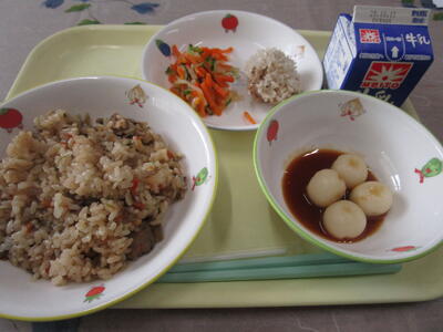 牛乳 五目ごはん もち米蒸し 野菜の中華漬け みたらし団子