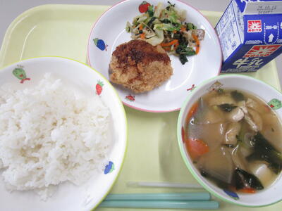 牛乳 ご飯 いわしハンバーグ もやしサラダカレー みかん