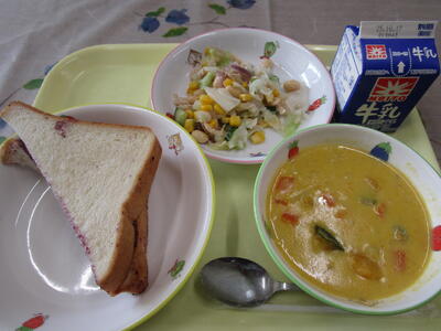 牛乳 食パン ブルーベリージャム かぼちゃのシチュー 大豆入りサラダ