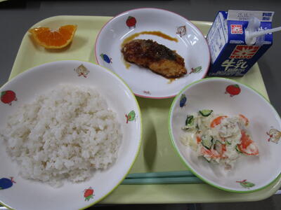 シイラは身がピンク色で、大きいものは2メートルにもなります。ハワイではマヒマヒともいわれ、高級魚として扱われています。鮮度保持が難しく、傷みも早いので流通されにくい魚でしたが、最近では、その利用に注目が集まっています。今日は長崎県産のものを使っています。給食では、米粉をまぶして油で揚げました。トマト、ケチャップ、レモン果汁、塩コショウで作ったトマトソースをかけました。