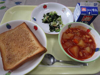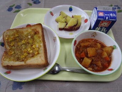 牛乳 ツナコーントースト チリ・コン・カーン さつまいものレモン煮