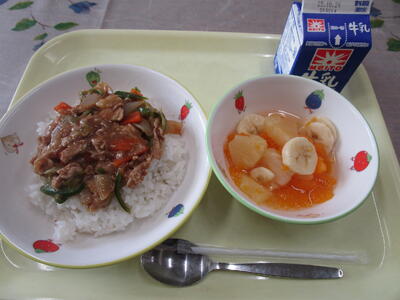 牛乳 ホイコーロー丼 フルーツポンチ