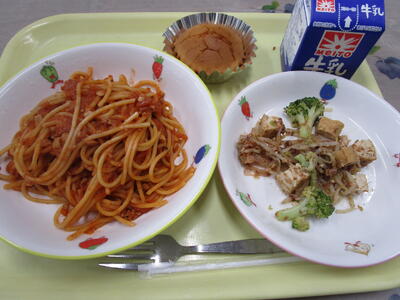 牛乳 スパゲティボロネーゼ 生揚げのおかかサラダ ぐりとぐらのカステラ米粉