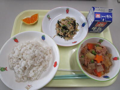 ごはん 肉じゃが 納豆和え みかん 牛乳
