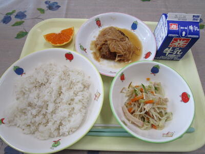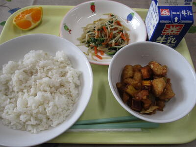 牛乳 ご飯 鶏肉と蓮根の揚げ煮 もやしナムル みかん