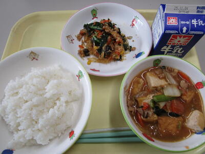 牛乳 ご飯 鶏肉と高野豆腐の揚げ煮 ほうれん草の香味和え