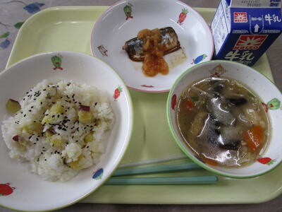 牛乳 さつまいもご飯 さんまの塩焼き 田舎汁