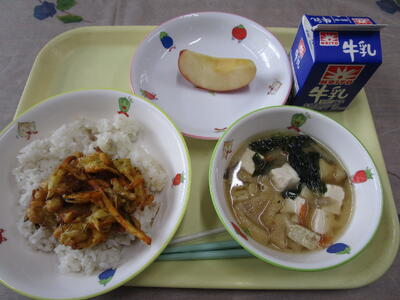 歯でかんで食べることを「そしゃく」といいます。近頃は「かまない」「かめない」「かむ意欲が少ない」といった「そしゃく」の運動不足が多いそうです。「そしゃく」不足は消化を悪くするだけでなく、食べすぎにもつながります。それが生活習慣病の原因につながることもあります。よく噛んで食べる習慣を今のうちに身に着けたいですね。給食のかき揚げは豆や昆布、たまねぎを材料に使い小麦粉のころもで生地をまとめ、油でかりかりに揚げました。今日の給食をよく噛んで食べるための工夫は①食べ物を少しずつ口に運ぶ②噛んで食べるときの音を聞く③汁物や飲み物と一緒に口の中のものを流し込まないようにするです。今日はりんごも皮つきにしてよく噛めるようにしました。