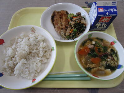 牛乳 焼き鳥丼 胡麻和え さつま汁
