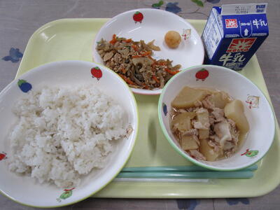 旧暦10月10日つまり新暦の11月29日は東日本に伝わる「十日夜(とおかんや)」という収穫祝いの行事の日です。別名「大根の年取り」ともいわれ、畑に植えた大根が大きくなる日とされました。子ども達は藁鉄砲で地面をたたいてまわります。これは畑に害を与えるもぐらなどの小動物を追い払うおまじないをして五穀豊穣(穀物が豊かに実ること)を祈ります。新暦の11月10日に「十日夜」とする地方もあると聞き、今日は大根を使った献立にしました。今日は千葉県産と茨城県産のものを使いました。煮物は味がしみこむように調理員さんが考えて煮てくれてました。