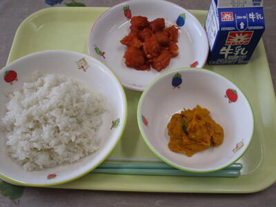 牛乳 ご飯 タラとじゃがいものチリソース かぼちゃサラダ