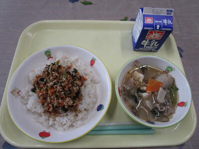 牛乳 カレーそぼろ丼 八宝味噌汁 みかん