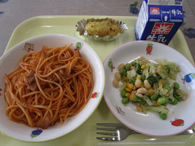 牛乳 スパゲティナポリタン ささみ豆サラダ さつまいも焼き