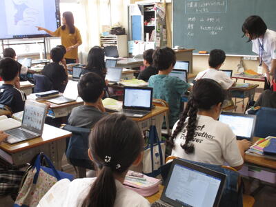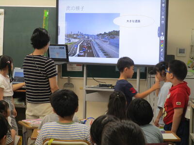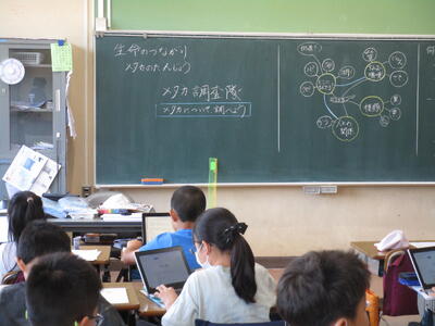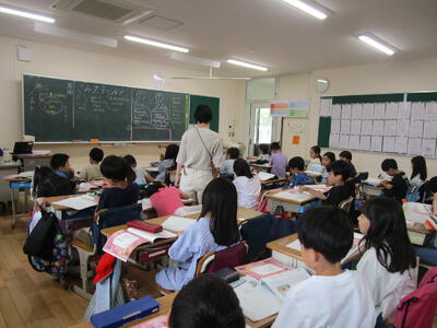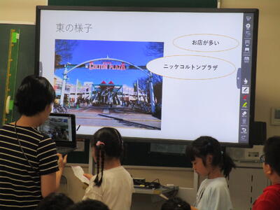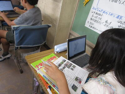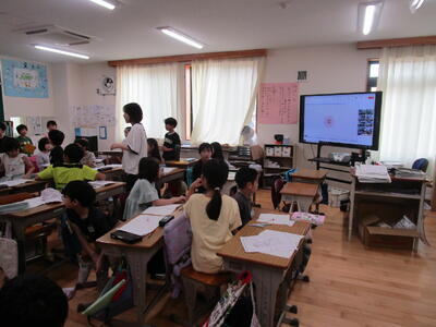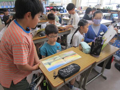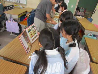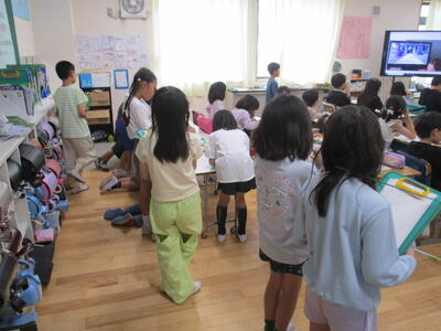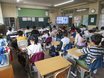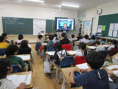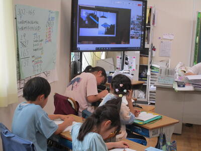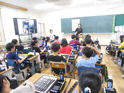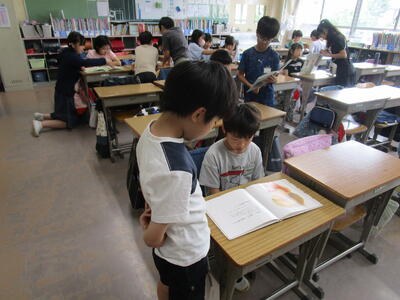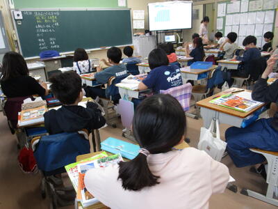 4年生の国語科で「一つの花」を学習しています。戦争に関する資料を見ながら、その当時の様子について学習していました。『火垂るの墓』からその当時の生活や家族の思い、行進している兵隊の姿が映っている写真から感じた戦争の怖さを図書資料や映像資料を活用し、子どもたちと共有しながら学びを深めていました。