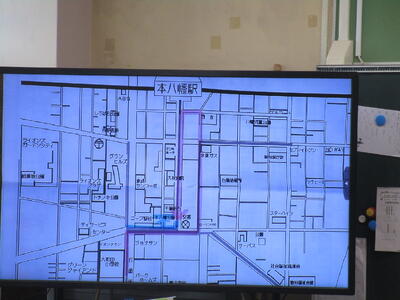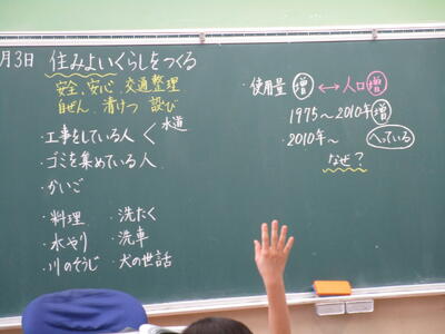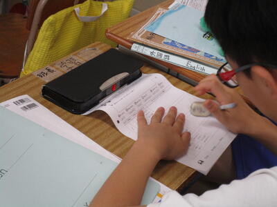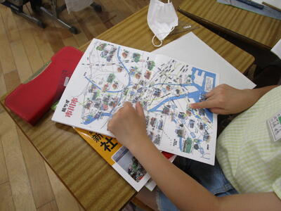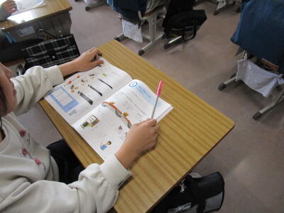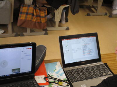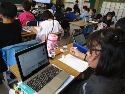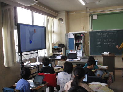 4年生の社会科の授業です。減災マップをもとに自分の住んでいる場所の状況を確認したり、避難場所はどれくらいあるのか、数えたりしていました。資料をもとに防災について考えていました。