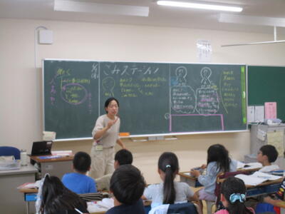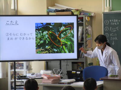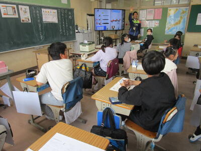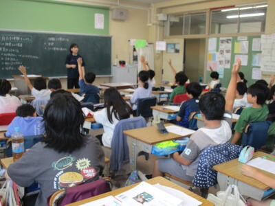 3年生の社会科の学習で梨農家の岡本さんをゲストティーチャーとしてお招きしました。本校の給食でも岡本さんの作った梨をいただいています。梨の成長や梨づくりの仕事についてのお話しでした。その中で食事(肥料)のタイミングや、冬眠する時期があることなど、わかりやすい言葉でお話ししてくださったので、聞きたいことがどんどん出てきました。また実際に使っている道具も見せてくださったので、梨づくりについて理解を深めることができました。