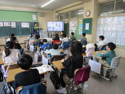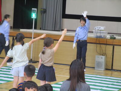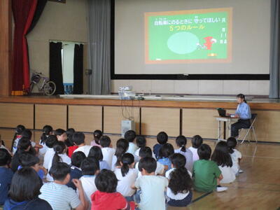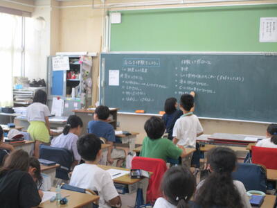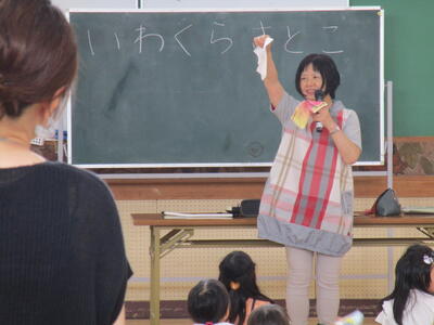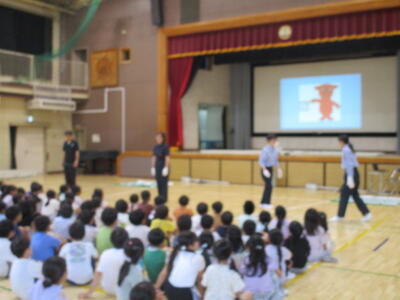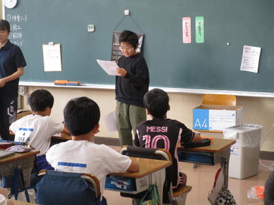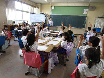 1年生の人権教室です。人権擁護委員の先生が2名来校し、各クラスで授業が行われました。日常の中での場面を取り上げ、どうすればよいかみんなで考えます。今回は1人で遊んでいる子を4人の子どもたちが鬼ごっこに誘おうとするのですが、それぞれに思いが違います。意見がまとまり、「遊ぼう」と誘った後にも相手の状況や気持ちを大事にして、相手の気持ちを聞くことも忘れないようにするといいねと考えることができました。