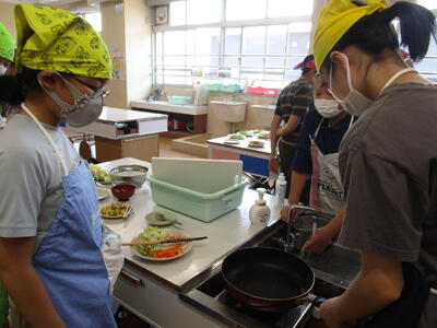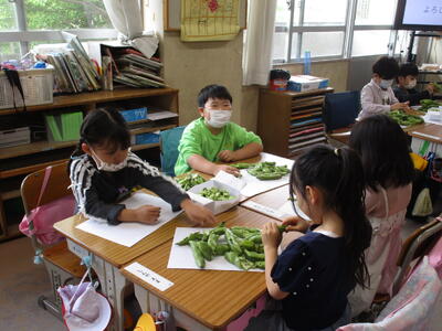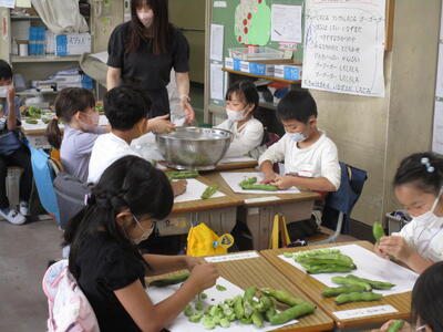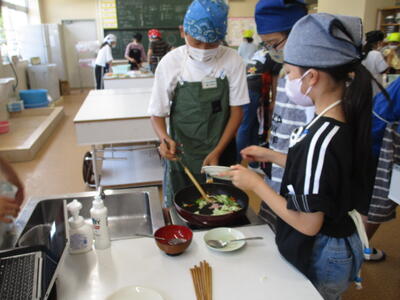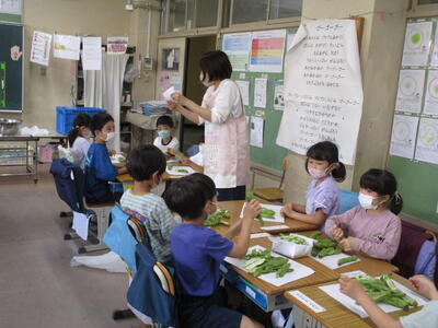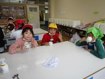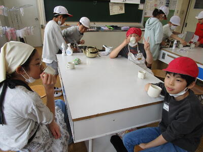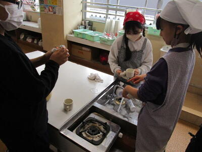 5年生の調理実習の様子です。どのグループもよい出来上がりで、「食べてください。」とお給仕してくれました。おみそ汁の具は人参、ジャガイモ、大根から1つと豆腐か油揚げのうち、どちらかとねぎの3つを用意し、煮干しのだしで作りました。残った煮干しも、お醤油をかけて余すことなく食べているグループもありました。みんな笑顔で「おいしい。」の声があちらこちらから聞こえてきました。