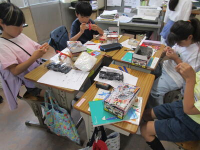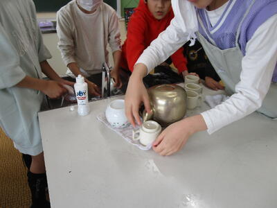 4年生の図画工作科の液体ねんどを使った作品作りです。ペットボトルなどをつかって型取りをするのですが、ねんどに浸した布が思うようには張り付きません。形を整えながら、ねんどをさらにつけ、乾燥させます。固めた布から想像を膨らませ、イメージした色を付けていました。