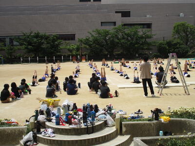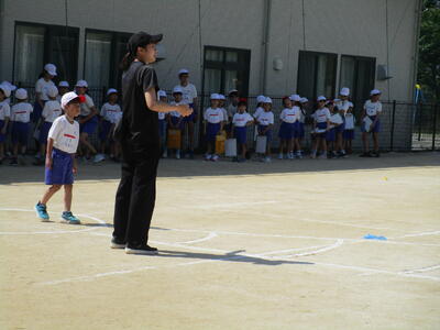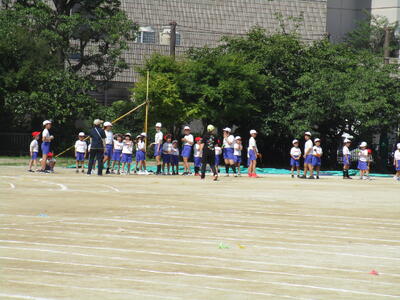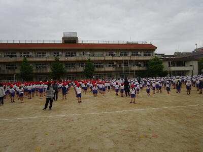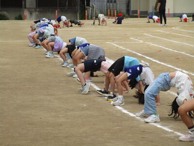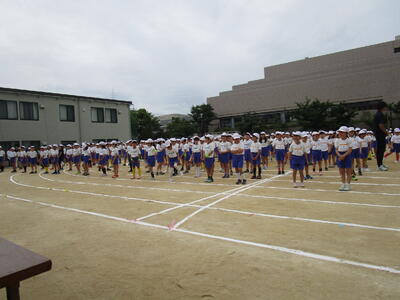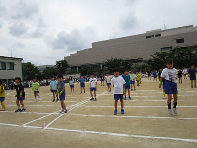 長縄練習期間を終え、記録会が開催されます。今日は2年生、4年生のペア学年です。2年生が3組までなので、4年生も3グループに分かれます。前半後半で記録会を行うのでそれぞれ半分の人数となり、全部で6つにわかれました。それぞれ2年生4年生が交互に並んで飛んだり、2年生と4年生の学年ごとに固まって並んだりと作戦はいろいろです。