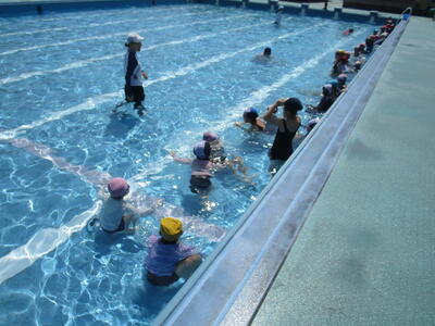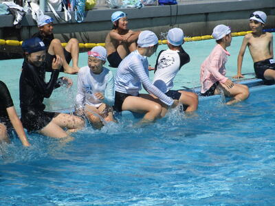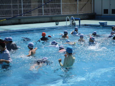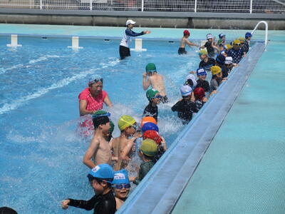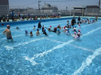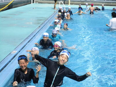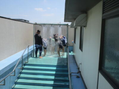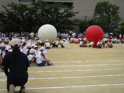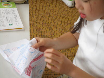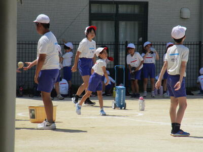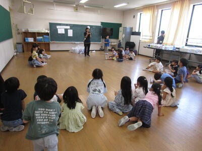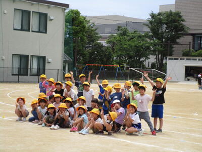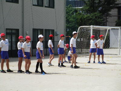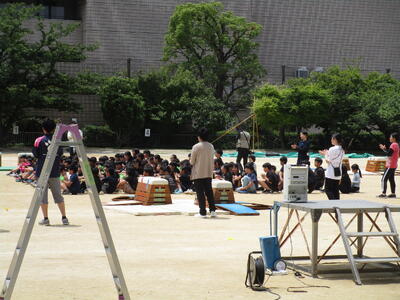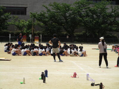 今日はシャボン玉日和で、良い風が吹いています。1年生のシャボン玉出前授業です。校庭で各クラスに分かれて大きなシャボン玉を飛ばしていきます。わっかになったロープを手にシャボン液をつけて腕を動かしていきます。構えているだけでも風のおかげで自然にシャボン玉ができることも。手に乗せたり、口で吹いてみたりいろいろな遊び方をしていました。体中石鹸だらけにして楽しそうでした。