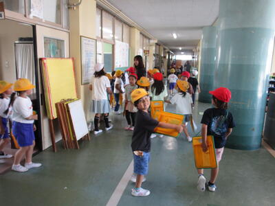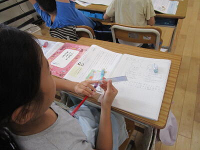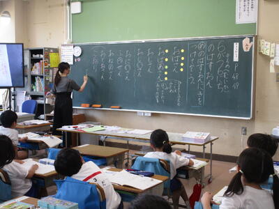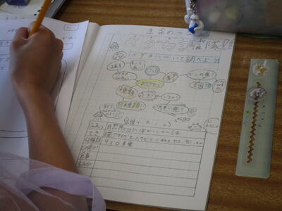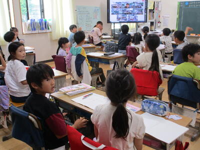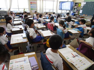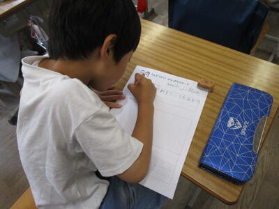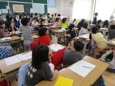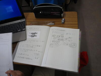 1年生の国語科の授業です。『スイミー』でお手紙を書きますが、その前にだれが何をしたのかを魚になりきってお話ししました。お面をつけて、みんなの前で発表していきました。どんなお手紙になるのか楽しみです。