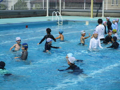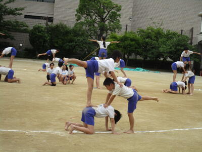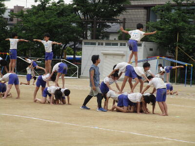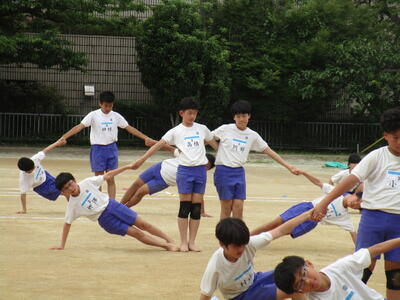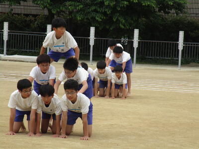 1年生が2クラス合同の体育です。今日はマット運動で、菊池先生の説明を聞いていろいろな動きを行いました。リズムに合わせてくま歩きをするのですが、初めてでうまくできなくても、みんな楽しそうでした。くま歩きレベル3ができるよう頑張っていました。