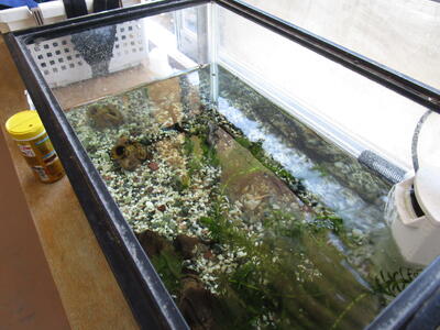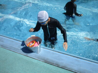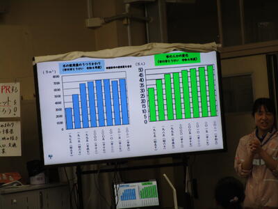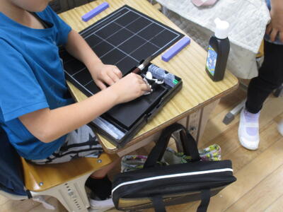 4年生の理科の授業で観察を行っていました。土の粒と水のしみこみ方について予想を立て、確かめていました。