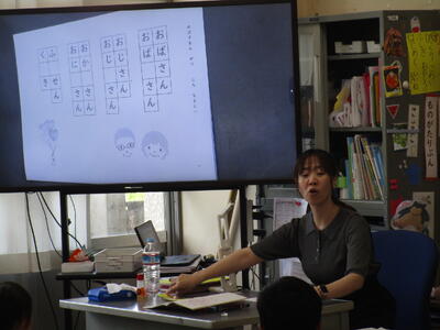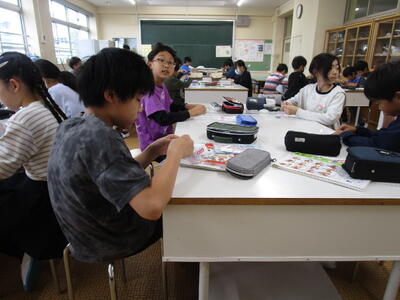 千葉大学の松井先生を招いて社会の歴史について学びました。いろはに合わせて歴史をかるたにしているのですが、遊びながら覚えていくというものでした。まだ学習していないところもありましたが、リズムやかるた遊びの良さでそれぞれの班ごとに楽しく活動できました。