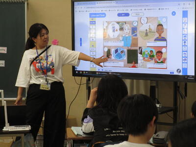 1年生の外国語の授業でALTの織田先生と学習しました。好きなものを答えるのですが最初は好きな色、次は好きなスポーツを尋ねていました。色はブルーが人気でした。鬼ごっこは「tag」というそうです。途中で好きなスポーツを友だちと話し合いながら楽しく活動しました。