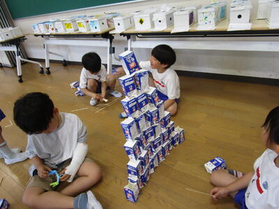 1年生の図画工作科で紙粘土を使って作品作りを行っていました。すごーく伸びる素材で、軽い粘土です。先生の見本の粘土と比べると重さが全然違いました。みんなで重さを確かめて驚いていました。みんなが使っている粘土は伸ばしていくと糸のように細くなり、自由自在に形が変わっていきます。こねて伸ばして、型押しして、粘土板に立てていく。楽しそうに活動していました。