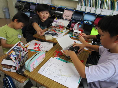 3年生の図画工作科の授業です。箱の中の世界を紙粘土やいろいろな材料を使って作っていきます。みんなで作り方を確認し、設計図をもとに進めていきます。どんな作品になるのか楽しみです。