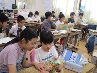 朝読書の時間、今日は6年生と1年生のペアと3年生と5年生のペアでの読み聞かせです。対面だったり、横に並んだり、スタイルはいろいろです。読み聞かせが終わると1年生は読書の記録に記入をしていました。6年生が見守ってくれている様子も見られました。