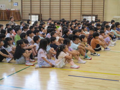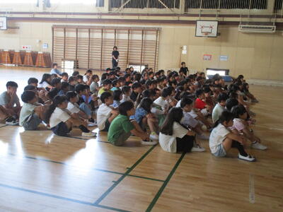 6年生の被爆体験者講話が行われました。毎年開催されているのですが今年度は、児玉三智子さんが来校されました。3人で活動されていること、市内でも20校以上、松戸市でも同じくらいの数の学校を回っているとのことでした。被爆したのは7歳の時で現在は88歳とのことでしたが、大変お元気でした。実際にこのような体験を話すことができる人も少なくなってきているけれど、戦争や核の悲惨さについてできる限り伝え続けたいとのことでした。戦後80年、いろいろなところで様々な取り組みがなされています。子どもたちは児玉さんの話に集中していました。