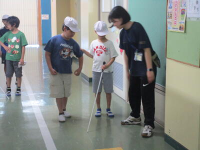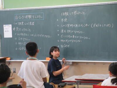 4年生の総合的な学習で「福祉」に取り組んでいます。今日はゲストティーチャーとして大井よしみさんをお招きしました。事故にあわれて大きなやけどを負い、それがもとで目が見えなくなったそうです。一度手術によってしばらく見えるようになったそうですが、再び見えなくなり、現在に至っているとのことでした。目は不自由ですが、積極的にいろいろな活動をされていました。実は3年生と5年生で行った学校支援実践講座にも地域の方の一人として一緒に話し合いに参加してくださっていました。目が見えなくなって困ったことや、見えなくなってもできることやいろいろな人への感謝の気持ちなど4年生のいろいろな疑問に答えてくださいました。