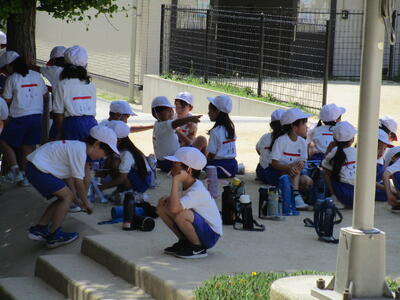 今日は5年生の校外学習。江戸川(行徳橋)へ向かい、自然や生き物について学びます。虫かごを手にみんなウキウキ、わくわくした様子でした。どんな生き物に触れ合えるか楽しみです。