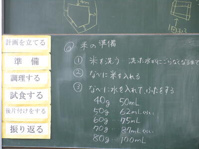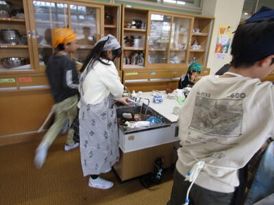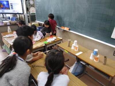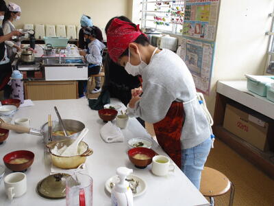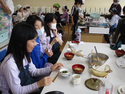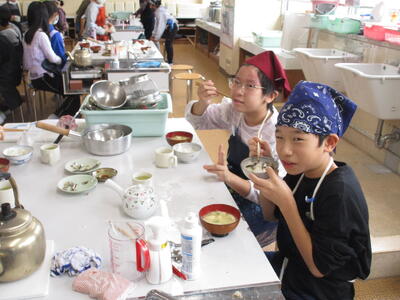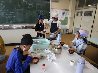 5年生の調理実習の様子です。どのグループもよい出来上がりで、「食べてください。」とお給仕してくれました。おみそ汁の具は人参、ジャガイモ、大根から1つと豆腐か油揚げのうち、どちらかとねぎの3つを用意し、煮干しのだしで作りました。残った煮干しも、お醤油をかけて余すことなく食べているグループもありました。みんな笑顔で「おいしい。」の声があちらこちらから聞こえてきました。