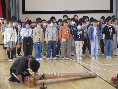 4年生が鉄の性質について学習していました。先生が実験をしてみせていました。実験用のガスコンロで鉄球を温めてからリングを通るか確かめ、そのあと鉄球を冷やして同じように確かめます。「おー」という声が上がり、状態が変化したことに気づきました。この後、その結果をまとめていきます。