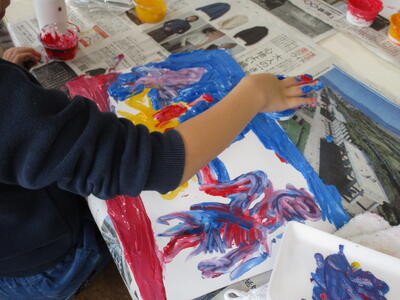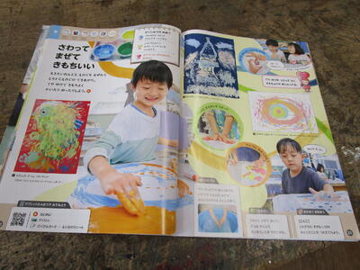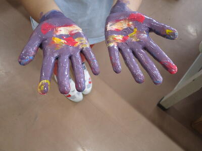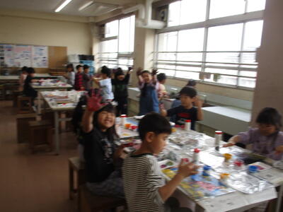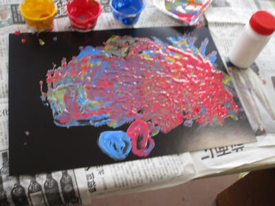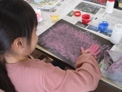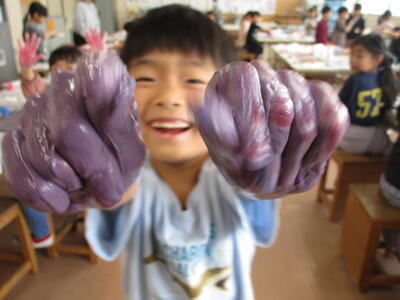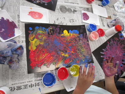1年生の図画工作科の様子です。「さわってまぜてきもちいい」というテーマですが、色を混ぜた工作用のりを手に取り、台紙に塗っていきます。黒と白の台紙はどちらを選んでもよいです。最初は指先でちょんちょんとさわるような感じで描いていましたが、時間がたつにつれどんどんダイナミックに。触感を楽しみながら、想像力を膨らませて思い思いの作品に仕上げていました。みんな笑顔いっぱいで絵の具のついた手のひらをみせてくれました。