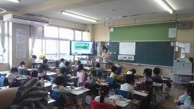 黒板の絵カードや大型提示装置に映ったデジタル教科書を活用しながら、英語でのやり取りを楽しむ工夫が見られました。