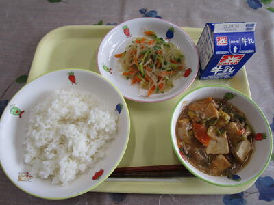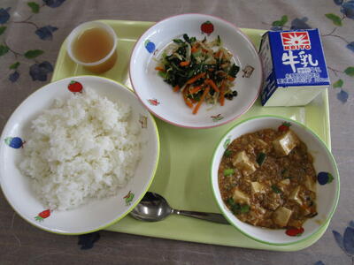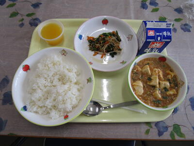 牛乳 ご飯 麻婆豆腐 ほうれん草のナムル オレンジゼリー